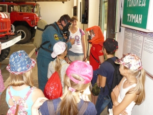 В пожарной части ребятам провели экскурсию по зданию части. Зрелищное действие происходило в гараже боевых машин. Пожарные показывали ребятам предметы боевой одежды, пожарно-спасательное оборудование. Ребятам рассказали об имеющихся в распоряжении части пожарных машинах - как они работают, чем оборудованы. Дети с большим интересом слушали огнеборцев.