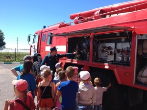 Перед началом экскурсии инспекторы надзорной деятельности и профилактической работы рассказали мальчишкам и девчонкам об истории возникновения пожарной охраны, о профессии огнеборцев, провели с детьми профилактическую беседу о правилах пожарной безопасности и безопасности на воде. Инспекторы напомнили малышам телефоны, по которым нужно звонить, если случилась беда, вручили им красочные памятки.