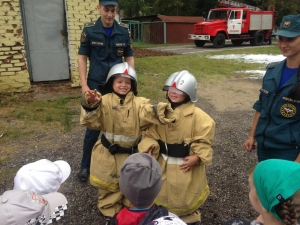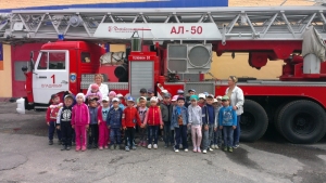 В гараже личный состав продемонстрировал детям профессиональную подготовку пожарного караула, норматив одевания боевой одежды огнеборцев, а также - сбор и выезд по тревоге. Тревога к счастью была учебной. Ребята с большим удовольствием изучали пожарную технику, задавали много вопросов, и, пользуясь случаем, сделали фото на память.