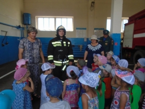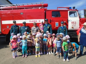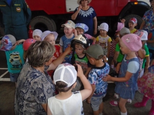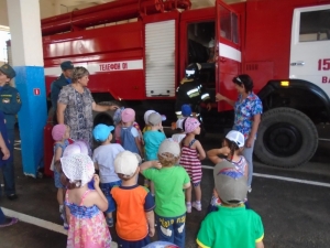 Особенно ребят заинтересовала пожарная техника: дошколятам рассказали о службе пожарных, о пожароопасных предметах, которые нас окружают и представляют потенциальную опасность, о приборах, которыми можно пользоваться только под присмотром взрослых. Каждый желающий мог примерить экипировку пожарного, а в завершении экскурсии юные экскурсанты стали участниками веселых игр и викторин.