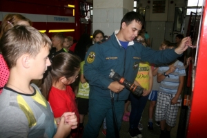 Вторая часть мероприятия позволила ребятам познакомиться с профессией пожарного. Воспитанники и вожатые лагеря посетили пожарную часть, где гости смогли примерить на себя пожарное снаряжение, показать навыки в оказании помощи пострадавшим, а также размотать пожарный рукав и присоединить к нему пожарный ствол. Больше всего восторгов у ребят вызвала демонстрация пожарной техники и оборудования, теплоотражающих костюмов и средств газодымозащиты.
