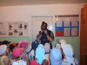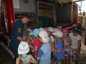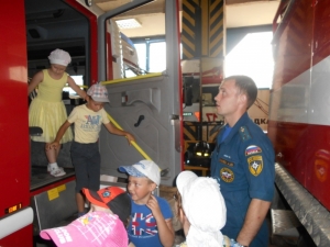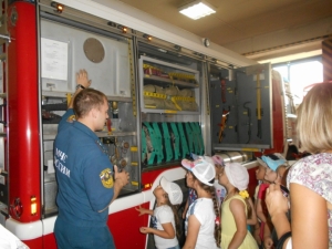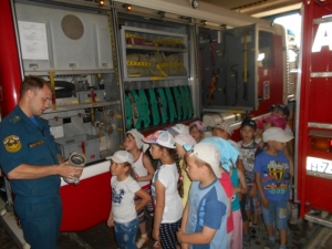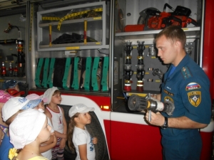 Старший лейтенант внутренней службы Александр Викторович Синёв рассказал про пожарную технику и показал детям, как и чем оборудованы машины, для чего служит тот или иной предмет из многочисленного пожарно-технического вооружения.