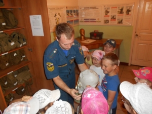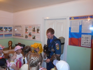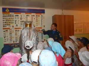 Александр рассказал и показал ребятам, как и чем, вооружен пожарный-спасатель для борьбы с огненной стихией. Ребятам показали предметы боевой одежды, пожарно-спасательный инвентарь. Сотрудники МЧС также разрешили ребятам подняться в кабину машины, ощутить себя пожарными. Пожарная техника и боевая одежда произвела на ребят сильное впечатление.