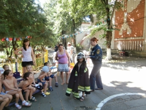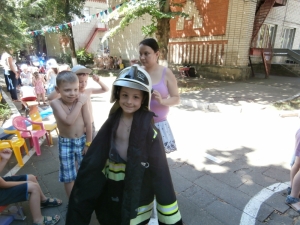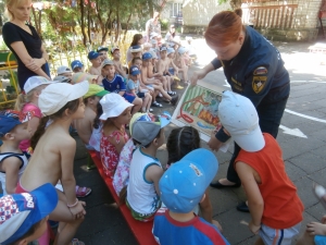 Самая интересная часть занятия ожидала ребят впереди, ведь в гости к ним приехали настоящие пожарные на мотоциклах быстрого реагирования. Для малышей было очень необычно увидеть вместо большой пожарной машины, маневренный и резвый мотоцикл. «Папа – пожарный» Михаил Тутукин продемонстрировал ребятам боевую одежду сотрудника пожарного, а также работу ранцевой установки пожаротушения ГИРС. Сотрудники СЧЭР 12-го отряда ФПС по Краснодарскому краю рассказали детям, что пожарный-мотоциклист может не только справиться с огнем, но и извлечь из транспортного средства пострадавших при ДТП и оказать первую медицинскую помощь.