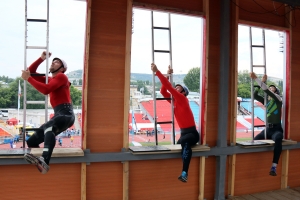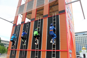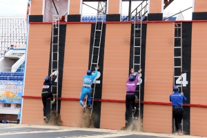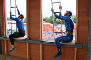 На данном этапе соревнований спортсменам предстояло выполнить подъем по штурмовой лестнице в окно учебной башни. Надо отметить, что мужчины поднимаются в окно четвертого этажа, женщины – второго. Ну, а юноши показали свое мастерство при подъеме в окно второго и третьего этажей башни (в зависимости от возрастной группы).