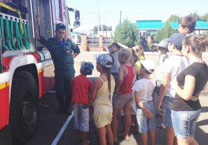 После специалисты чрезвычайного ведомства показали детям, как устроен пожарный автомобиль. Также продемонстрировали боевую одежду пожарного и другие приспособления, используемые при борьбе с огненной стихией.