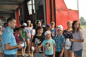 Далее началось самое интересное – для ребят открыли двери пожарного депо, где находится специальная техника: автоцистерны, автолестницы, автомобиль первой помощи.