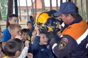 На открытой веранде «Энергетика» прошла выставка водолазного снаряжения и гидравлического инструмента. Спасатели Виктор Николаевич Фарченков и Юрий Георгиевич Граев познакомили юных футболистов и других постояльцев лагеря со специальным оборудованием.