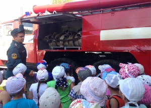 Затем все отправились в гараж, где ребятам продемонстрировали стоящие в боевом расчете пожарные машины. Дети были очень удивлены. Оказалось, что пожарная машина таит в себе целый арсенал вооружения предназначенного для тушения пожара и проведения аварийно-спасательных работ.