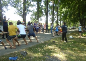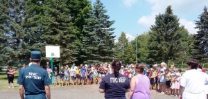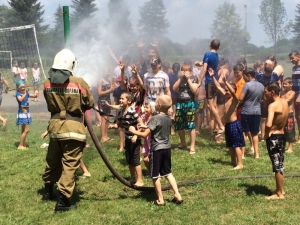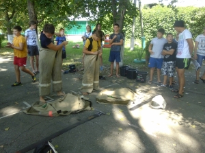 На территории лагеря огнеборцы провели с детьми пожарно-спортивную эстафету. Дети одевали боевки, раскатывали пожарные рукава и соединяли пожарные стволы на разветвлении. Также был организован конкурс по перетягиванию каната. По результатам проведенных конкурсов наиболее отличившимся детям были вручены грамоты.