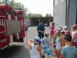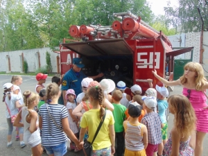 Экскурсия началась с осмотра помещений: учебного класса, спортивного зала, кухни, комнаты отдыха и, конечно же, гаража. Изучив всё в подробностях, маленькие гости направились на фасад части, где их уже поджидал пожарный автомобиль. Здесь начальник части – ветеран пожарной охраны – Сергей Владимирович Зайцев доступным для ребят языком объяснил, что находится в машине, и как огнеборцы используют то или иное оборудование в своей работе. Во время беседы вспомнил и номера спасения – «01», «101», «112», обсудил с ребятами опасность ложных вызовов, и напомнил правила пожарной безопасности.