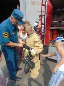 Затем приступили к самому интересному – примерке боевой одежды пожарного. Жаркая погода и яркое солнце не помешали одному из мальчишек полностью облачиться в одежду настоящего огнеборца.