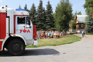 На протяжении всего лета ежедневно специалисты Центра противопожарной пропаганды и общественных связей столицы посещают детские лагеря Уфы и Уфимского района. Приезжают они не с пустыми руками: помимо веселой и полезной профилактической программы, дети могут примерить и пожарную каску, которую носили пожарные в начале 20 века, и современную форму огнеборцев. Яркие макеты и поделки, которые были созданы руками таких же детей, не оставляют ребят равнодушными, они с интересом рассматривают и «мягкие» огнетушители, и смелые подвиги пожарных, изображенные на холсте, и модели пожарных машин и пожарных частей.