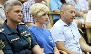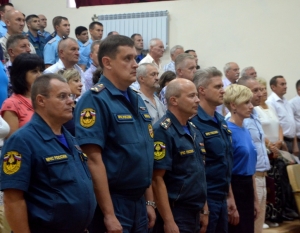 Мероприятие началось с минуты молчания и возложением цветов к памятному знаку в память о погибших сотрудниках севастопольской службы спасения.