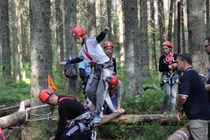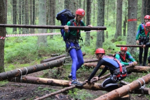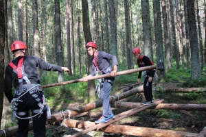 Преодолев болото и пробравшись по крутым склонам через поваленные деревья, ребята попадали на следующий этап. На этот раз им предстояло выложить аварийный знак в квадрате 5х5 метров при отсутствии подручных средств. Все команды быстро смекали, что лучше всего это сделать собственными телами и быстро собирались в предложенную судьёй букву.