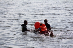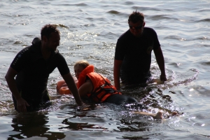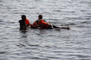 Из огня учатники сразу попадали в воду – требовалось спасти условно пострадавшего, подплыв к нему на одноместном плотике. Один их членов команды, не раздеваясь, отправлялся в плаванье и находил пострадавшего, после чего второй участник подтягивал плотик к берегу.