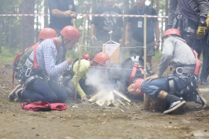 На следующем этапе ребята разводили костёр при помощи огнива. Требовалось не только зажечь огонь, но и поддерживать его до тех пор, пока он не пережжёт верёвку, натянутую над костром.