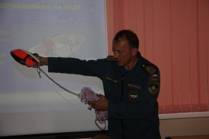 Александр Никитин, государственный инспектор по маломерным судам инспекторского отделения по г. Хабаровску ГУ МЧС России по Хабаровскому краю, не первый год работает на воде, и в своей практике сталкивался с разными ситуациями. Своим опытом он поделился с ребятами, рассказал, какую опасность таит в себе эта стихия, если нарушать правила безопасности при купании и катании на различного рода плавательных средствах. Он принес с собой средства спасания тонущих, такие, как спасательный круг и «конец Александрова». Ребята с большим интересом наблюдали за действиями сотрудника МЧС, который демонстрировал, как правильно их применять. Особое внимание при беседе было уделено оказанию первой помощи при утоплении. Из курса ОБЖ ребята вспомнили, как освобождаются легкие человека от воды, как проводится непрямой массаж сердца и искусственная вентиляция легких.