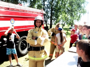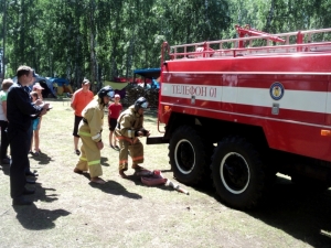 Первым делом, чтобы воодушевить отдыхающих детей, огнеборцы продемонстрировали боевое развертывание с огнем, водой и всем арсеналом пожарно-технического вооружения. Ребята с нескрываемым интересом познакомились с пожарной техникой, стоящей на вооружении в пожарной части и новым аварийно-спасательным оборудованием. На практике увидели работу пожарных с мотопомпой, работу лафетного ствола пожарного автомобиля, попробовали собственные силы в ликвидации условного пожара.