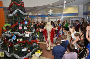 В актовом зале ребят, большинство из которых были в карнавальных костюмах, встретил фокусник. Он продемонстрировал детям волшебные фокусы и пригласил мальчишек и девчонок самим поучаствовать в магическом представлении. Спрятанные в платки шарики чудесным образом исчезали из рук маленьких волшебников, а потом неожиданно появлялись в карманах и за пазухой у детей. Появившаяся в разгар веселья Снегурочка предложила детворе поиграть в снежки. Запоздавшего на праздник Дедушку Мороза участники весёлого мероприятия вызывали хором и, он не заставил себя ждать. Вместе с внучкой он наградил участников и победителей конкурса новогодней игрушки и рисунка «Спасатель – профессия героическая», которые были объявлены ранее. Главный герой новогодних торжеств пригласил ребят спуститься в фойе к красавице-ёлке и продолжить праздник хороводами и песнями. С Дедом Морозом ребята зажгли огни на новогодней ёлке и рассказали Дедушке заготовленные к празднику стихотворения, получая в награду от главного символа Нового года подарки и угощения.