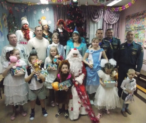 Детвора встретила представителей спасательного ведомства красочным концертом, посвященным Новому году. Дети весело играли в игры с Дедом Морозом, Снегурочкой, Снеговиком и бабой – Ягой. Дедушка Мороз порадовался рассказанным ребятами стихотворениям и подарил всем новогодние подарки.