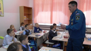 Далее инспектор ГПН наглядно показал и рассказал, как устроен огнетушитель, как им пользоваться, в каких случаях применять и где в школе он находится. Не забыл также упомянуть и о правилах оказания первой медицинской помощи.